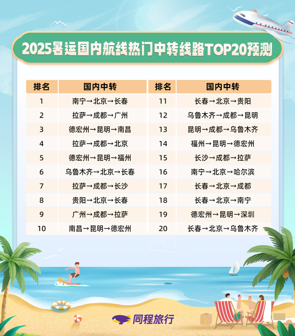 暑运中转联程出行方案需求上升,北京、成都、昆明等中转枢纽热度居前