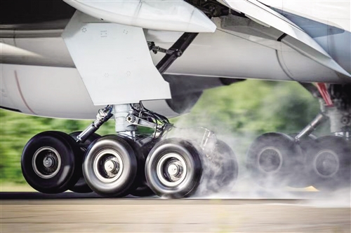 不仅如此,飞机轮胎胎面上的花纹也有讲究。在飞机着陆后的一段时间里,由于机体运动速度很快,在刚接触地面的一段时间内,轮胎处于打滑状态,其间会伴随轮胎的磨损,直到轮毂的转动速度赶上机体的运动速度,这也是为什么在飞机着陆时,我们能看到大量烟雾的原因。