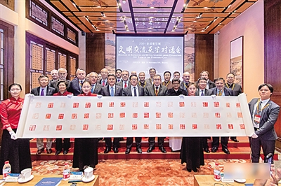 图为闭幕式上,与会嘉宾展示书法版《文明交流互鉴对话会北京宣言》。蔺紫鸥供图