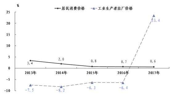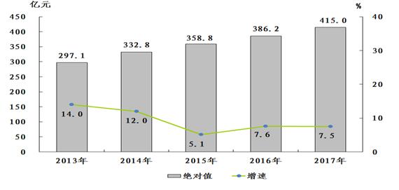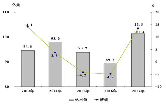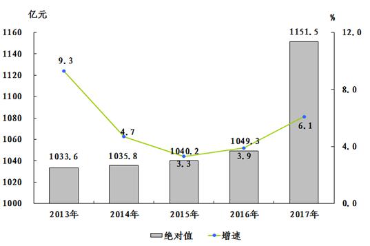初步核算,全年全市生产总值1151.5亿元,按可比价格计算,比上年增长6.1%。其中,第一产业增加值50.7亿元,增长1.3%,占生产总值的比重为4.4%;第二产业增加值618.9亿元,增长5.1%,占生产总值的比重为53.7%;第三产业增加值481.9亿元,增长8.0%,占生产总值的比重为41.9%。第三产业中,金融保险业增加值75.2亿元,增长8.0%;交通运输、仓储和邮政业增加值85.4亿元,增长12.0%;批发和零售业增加值65.0亿元,增长3.0%;住宿和餐饮业增加值32.9亿元,增长6.4%;营利性服务业增加值50.0亿元,增长9.6%。人均地区生产总值49487元,按2017年平均汇率计算为7326美元。图1:2013—2017年全市生产总值及增长速度