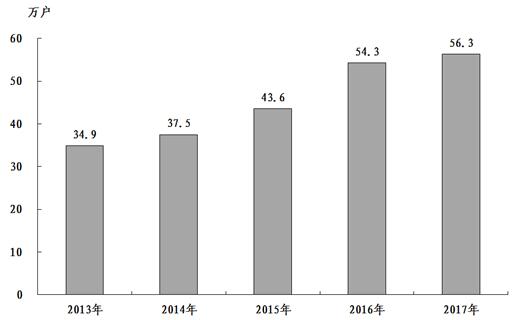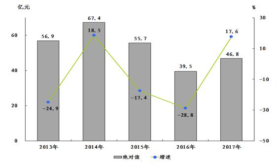 全年全市海关进出口总额46.8亿元,增长17.6%。其中,进口额34.2亿元,增长18.3%;出口额12.6亿元,增长15.7%。图7:2013-2017年外贸进出口总额及增长速度