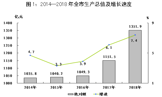 初步核算,全年全市生产总值1351.9亿元,按可比价格计算,比上年增长7.4%。其中,第一产业增加值49.2亿元,增长0.3%,占生产总值的比重为3.6%;第二产业增加值717.9亿元,增长7.2%,占生产总值的比重为53.1%;第三产业增加值584.8亿元,增长8.5%,占生产总值的比重为43.3%。第三产业中,金融保险业增加值86.8亿元,增长8.0%;交通运输、仓储和邮政业增加值100.9亿元,增长5.9%;批发和零售业增加值68.2亿元,增长3.2%;住宿和餐饮业增加值37.5亿元,增长6.7%;营利性服务业增加值82.6亿元,增长23.8%。人均地区生产总值57819元,按2018年平均汇率计算为8737美元。