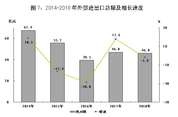 全年全市海关进出口总额46.0亿元,下降1.9%。其中,进口额33.4亿元,下降2.7%;出口额12.6亿元,增长0.2%。