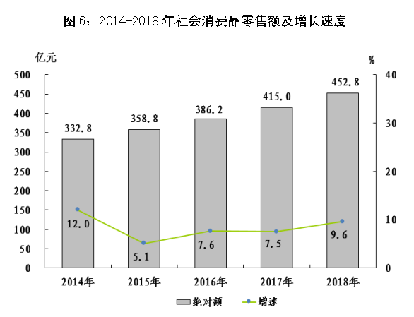 全年全市社会消费品零售总额452.8亿元,增长9.6%。按经营地统计,城镇消费品零售额383.9亿元,增长9.1%;乡村消费品零售额68.9亿元,增长12.4%。