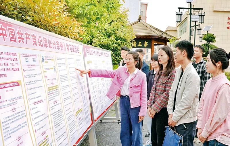 在全党开展党纪学习教育,是加强党的纪律建设、推动全面从严治党向纵深发展的重要举措。连日来,各地区各部门各单位精心谋划部署、抓住学习重点,推动党纪学习教育走深走实。图为2024年4月10日,江西省芦溪县纪委监委干部在《中国共产党纪律处分条例》学习宣传栏前交流。 邓建萍/摄