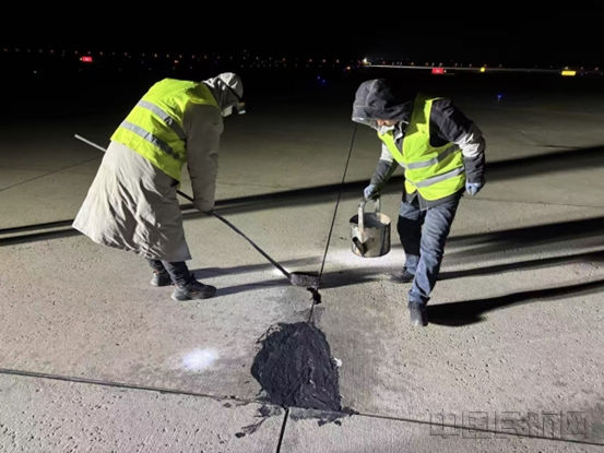 作业期间,呼和浩特机场飞行区管理部精心组织,周密部署,利用夜间停航时间段,在确保绝对运行安全的前提下,争分夺秒展开维修作业。作业人员克服低温不利影响,严格按照“清缝、烘烤干燥、灌注压实、表面整平”的工艺步骤操作,确保每一处修补都牢固可靠、平整顺接。